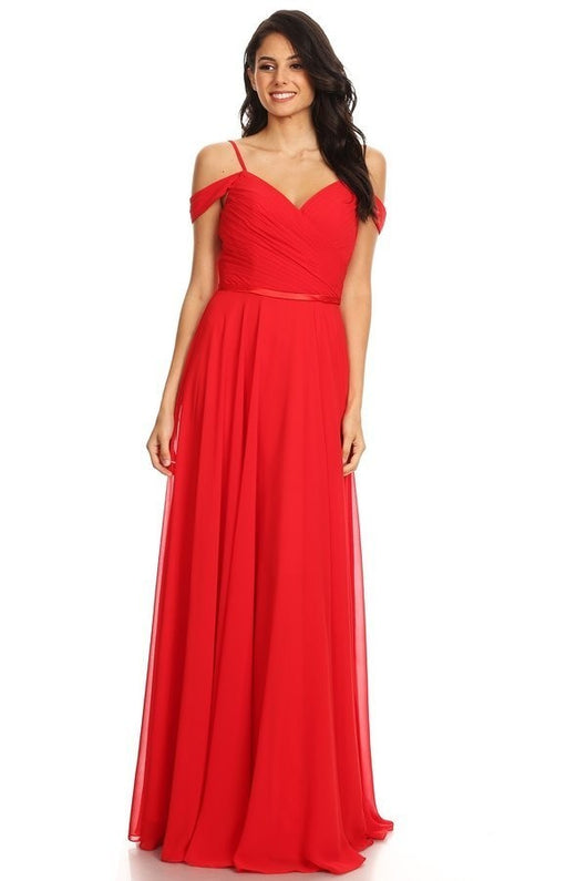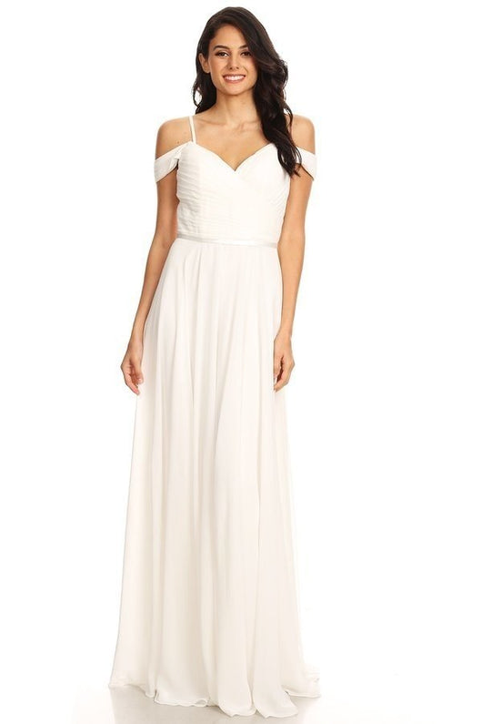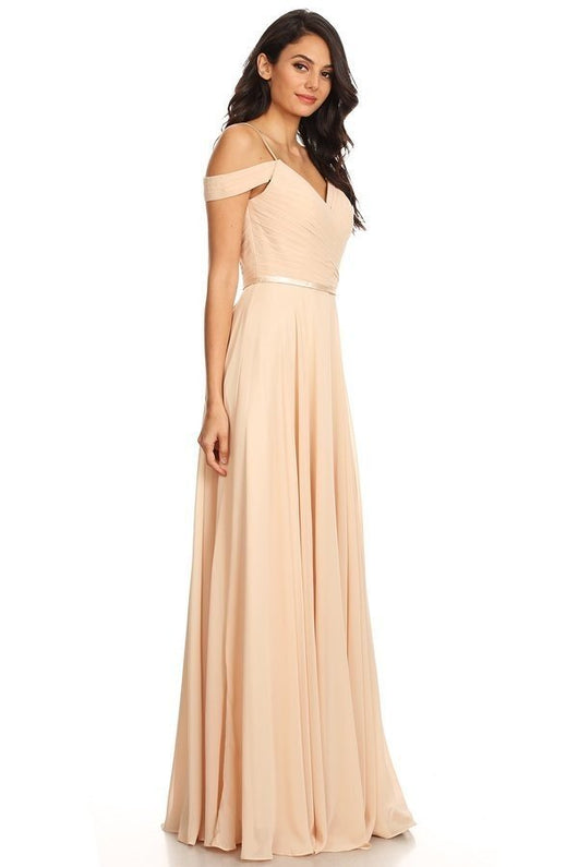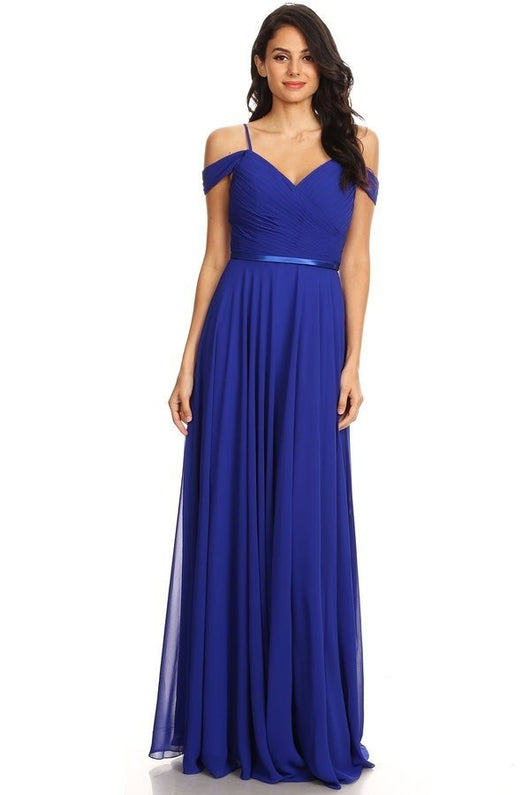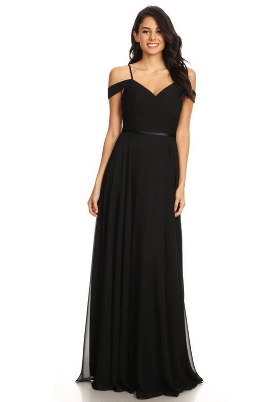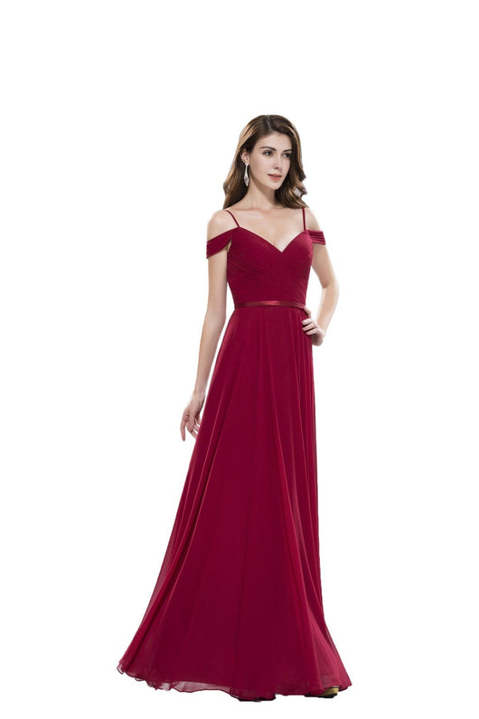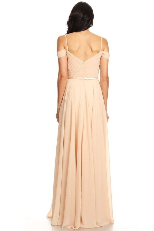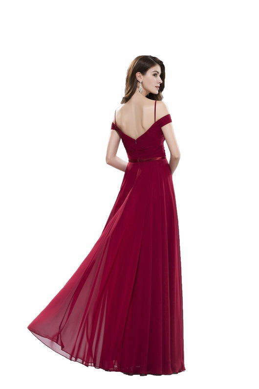 Bridesmaid dress features satin waistline belt . pleated bodice , gathered flowy skirt and off the shoulder straps