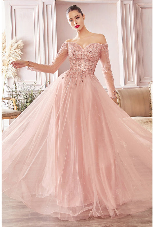 A-line off the shoulder layered tulle gown with floral beaded bodice.