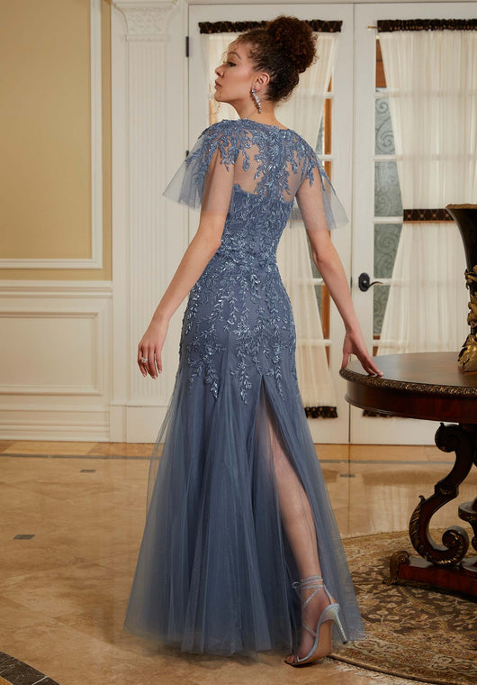 Luxe evening gown in light as air tulle features a romantic sweetheart neckline and frilled, flutter sleeves designed with stunning beaded embroidery leading down to the skirt with a slit in the back.