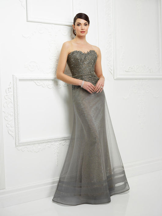 Strapless metallic lace and tulle slim A-line gown with scalloped lace sweetheart neckline, hand-beaded lace bodice with beaded natural waist, tulle over skirt features horsehair stripes at hemline.
