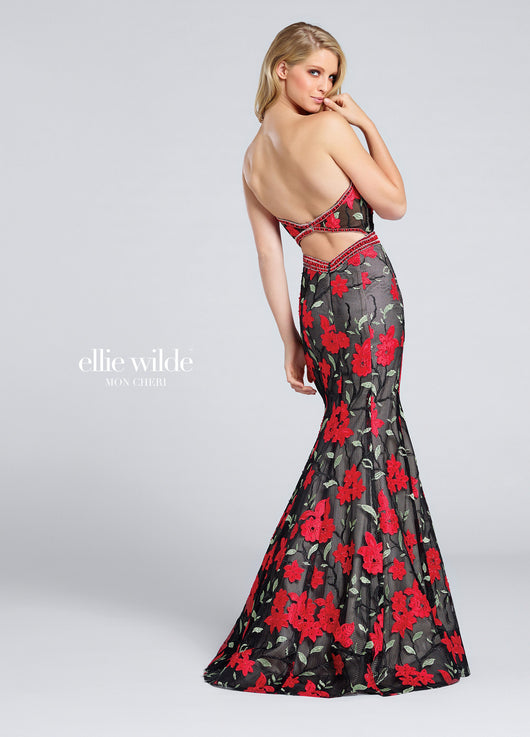 Strapless floral embroidered lace trumpet gown, hand-beaded plunging sweetheart neckline with illusion modesty panel, beaded waistband, open bandeau back, horsehair hem. Removable straps included.