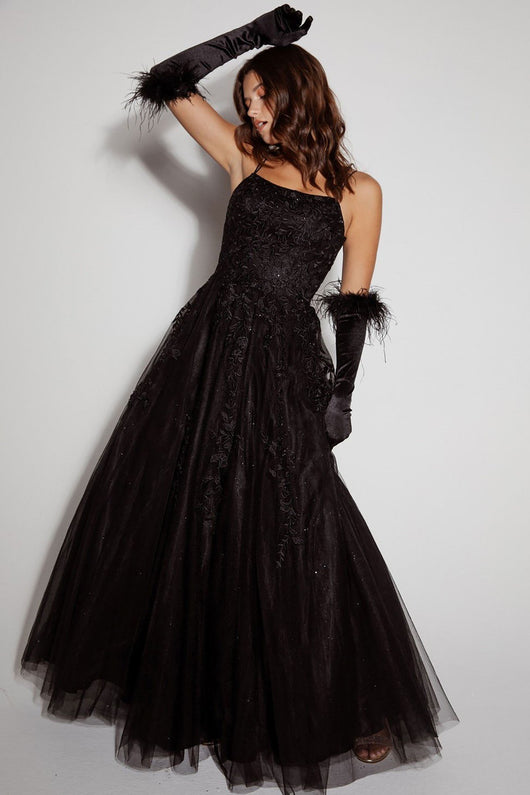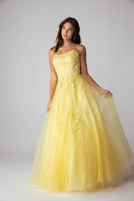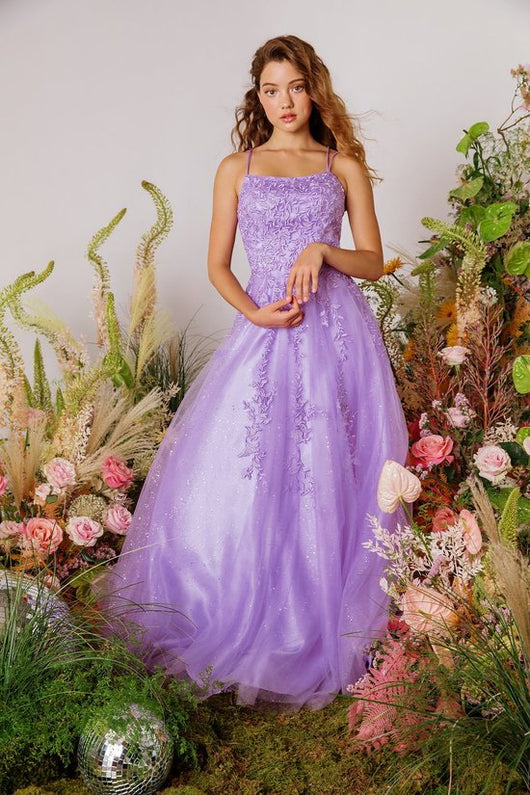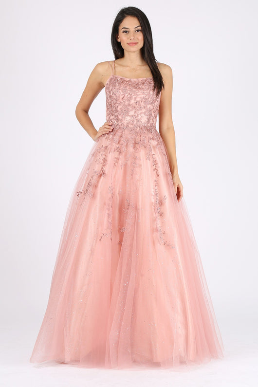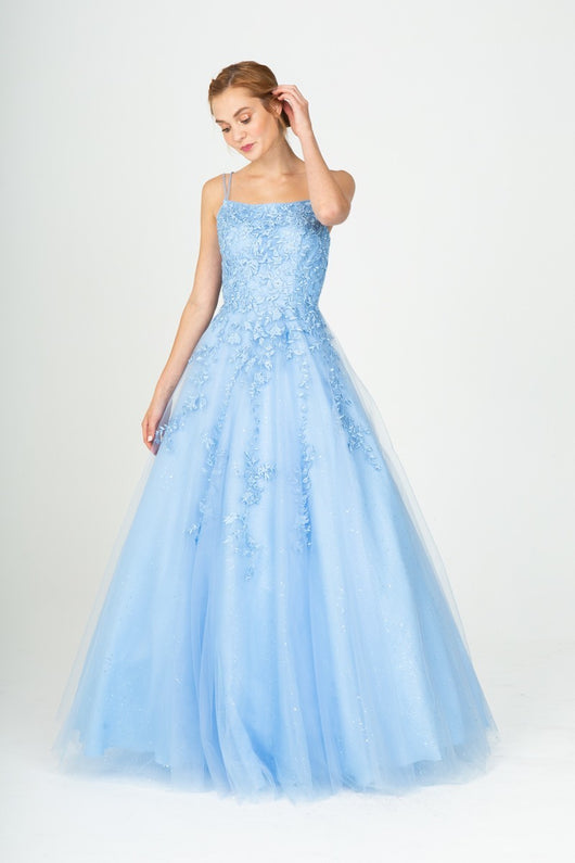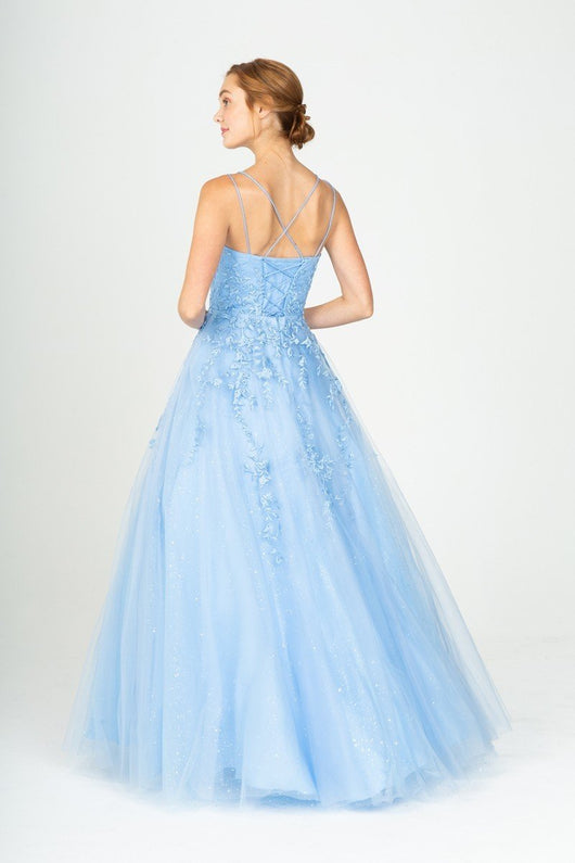 A-line silhouette, features 3D lace embroidery bodice with boning support, and mesh with glitter shimmer underlay, details with corset back and floor length skirt