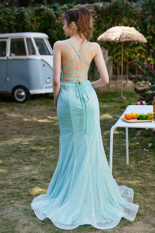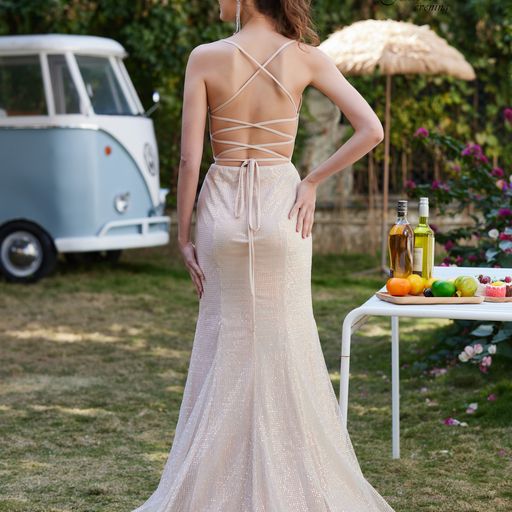 Fit and flare Sequin Dress, features a deep neckline , a skirt slit and a criss cross full open back