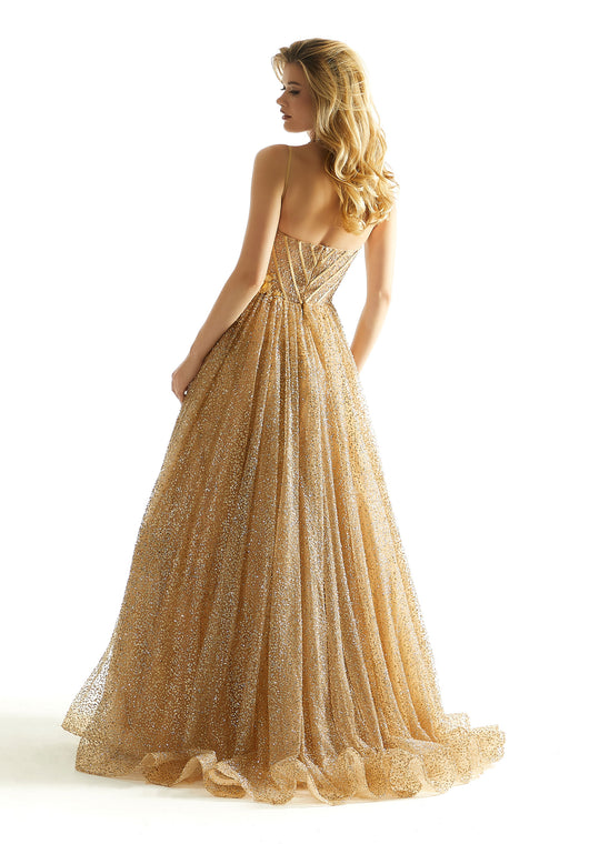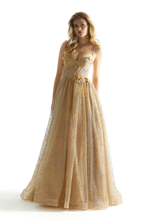 Gorgeous prom dress has a sheer bodice with artistic exposed boning and delicately beaded three-dimensional floral embroidery in glittering sequined tulle over sparkle tulle on a flowing A-line silhouette.