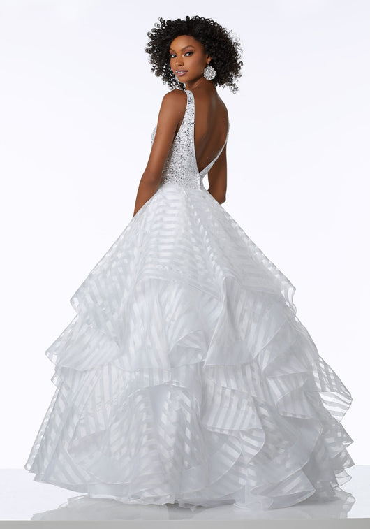Stunning Satin Striped Organza Ballgown with a Deep V-Neckline and V-Back. Sheer Insets Along Plunging Neckline and Sides. Colors Available: Black, White, Light Blue, Wine