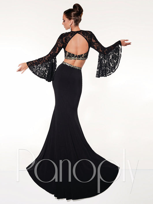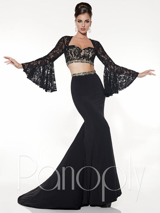 Make an entrance in this captivating two piece Panoply prom dress 14844. Featuring a lace crop to with a sweetheart neckline and bell sleeves that will catch everyone attention. Showcasing a simple open back with intricate beading lining the crop top. The skirt is a fitted jersey silhouette with a beaded belt to help cinch in your waist and a sweep train.