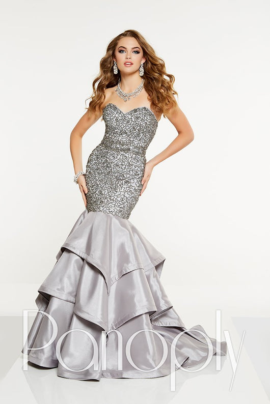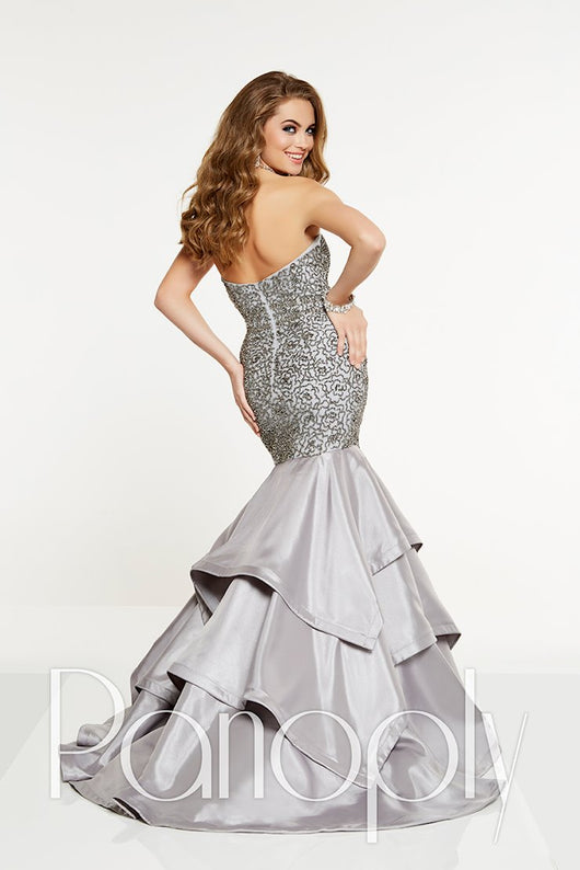 Look and feel beautiful in this long Panoply prom dress. The gown starts with a strapless sweetheart bodice that is adorned in a floral print of glass crystals. The satin mermaid skirt has three layers and with a sweep train. Panoply 14896 is perfect for prom, the pageant stage, or any other special occasion.