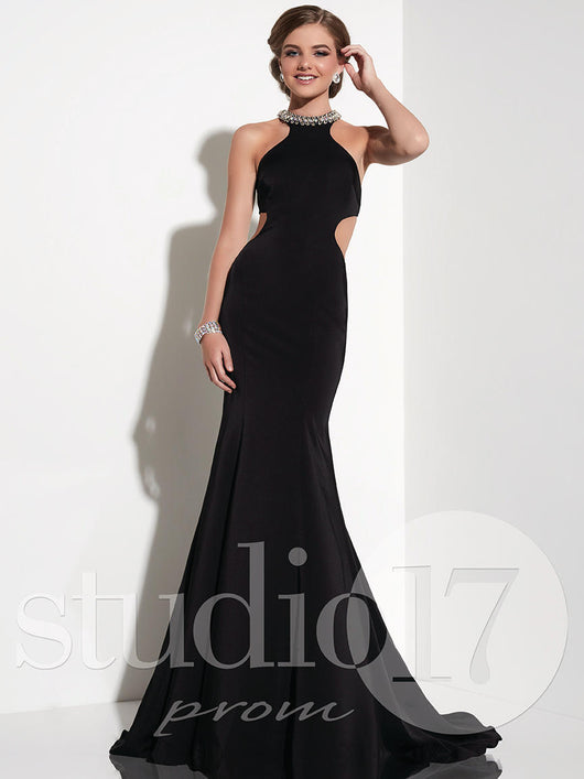 Timeless elegance is the look of this beautiful stretch satin gown. The choker collar is made of rhinestones, designed like a jewelry choker, and the dress has side cutouts to flatter the waist. The skirt is a full trumpet with a sweep train.