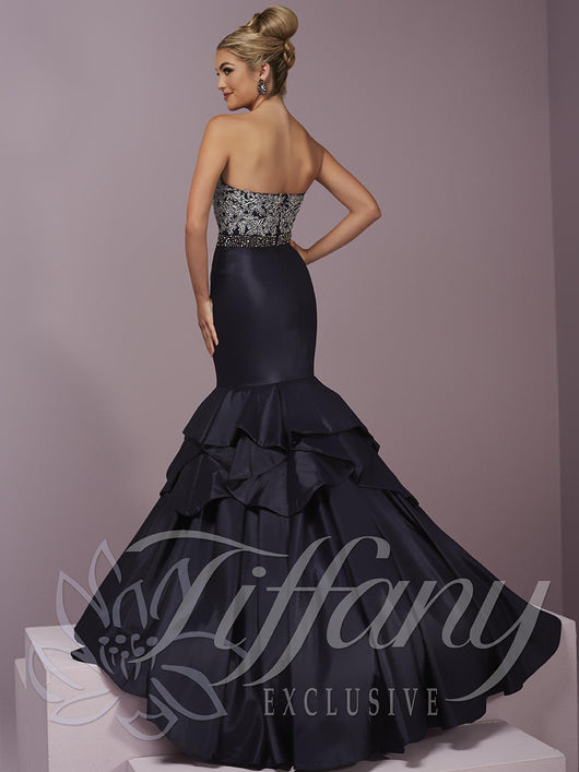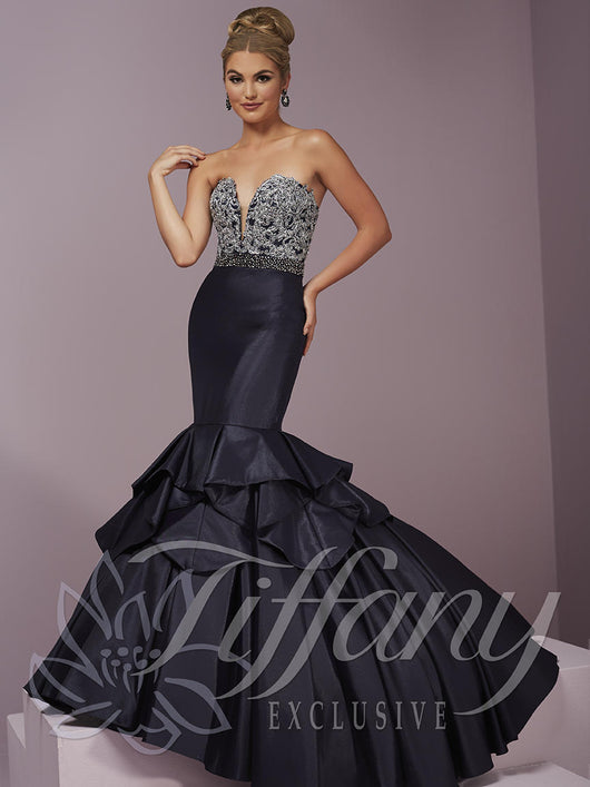 Take their breaths away in as you float into the party with this shimmering layered creation by Tiffany 46079. The stunner features a deep sweetheart neckline with sheer inset and a straight-across open back. The bodice displays a lovely display of metallic embellishments flourished on its surface. Bordered by a bejeweled waistband, the stunning mermaid skirt envelopes the body as it tapers down and terminates into a heavily ruffled flare. This exquisite detail finishes at a full-length hem and flows into a sweep train.
