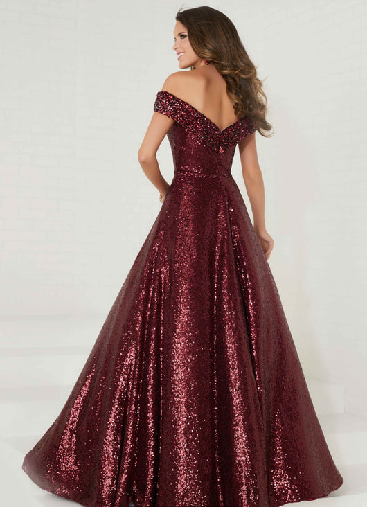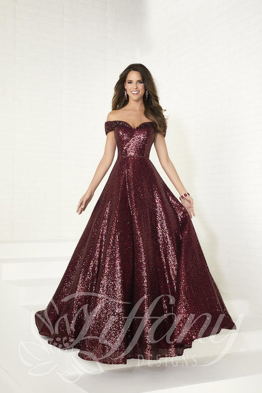 Breathtaking ball gown prom dress 16303 by Tiffany will have you sparkling all night long feeling like a princess. Enchanting gown showcases a lovely off the shoulder neckline paired with dainty cap sleeves leading into the slight open v cut back. The fully sequined gown features a romantic full skirt flowing out from the waistline as you dance the night away.