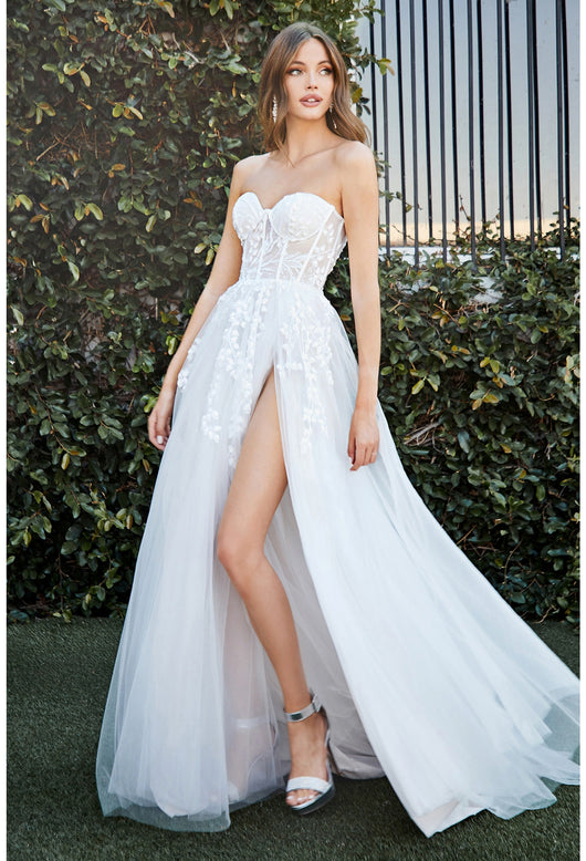A-line strapless wedding dress, layered tulle skirt with slit, lace applique over structured bodice.
