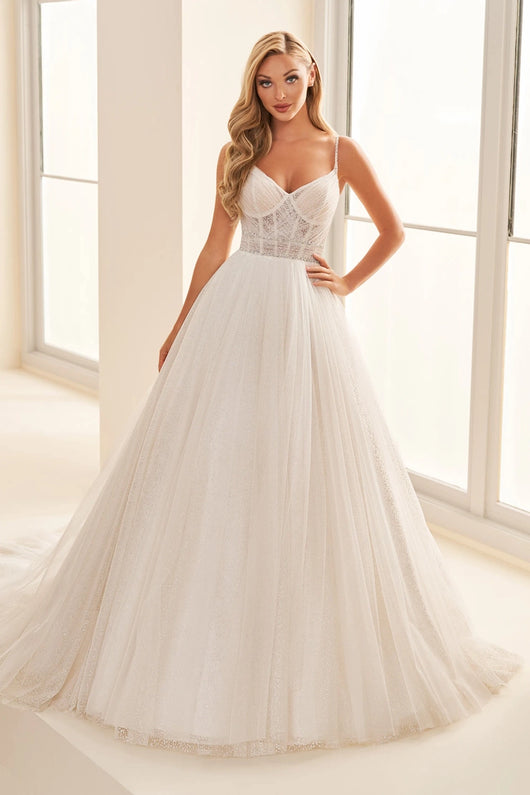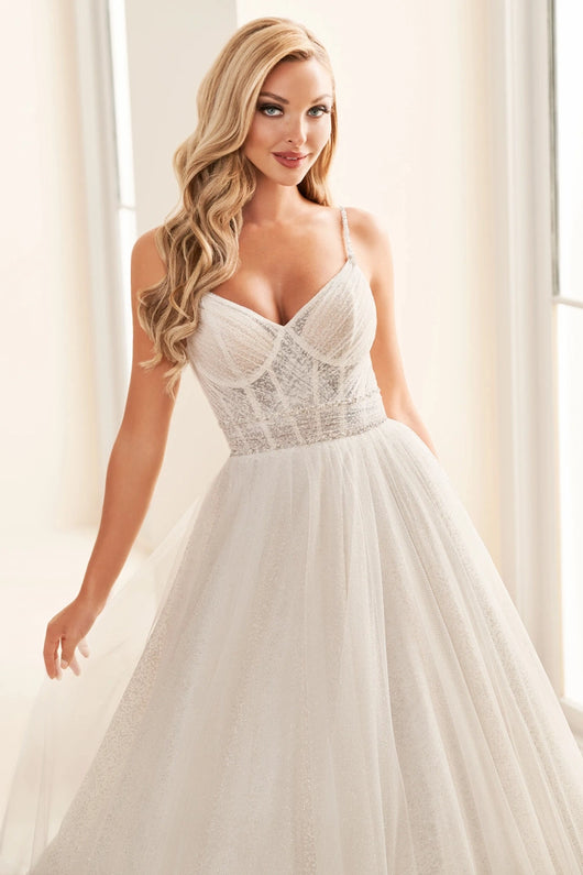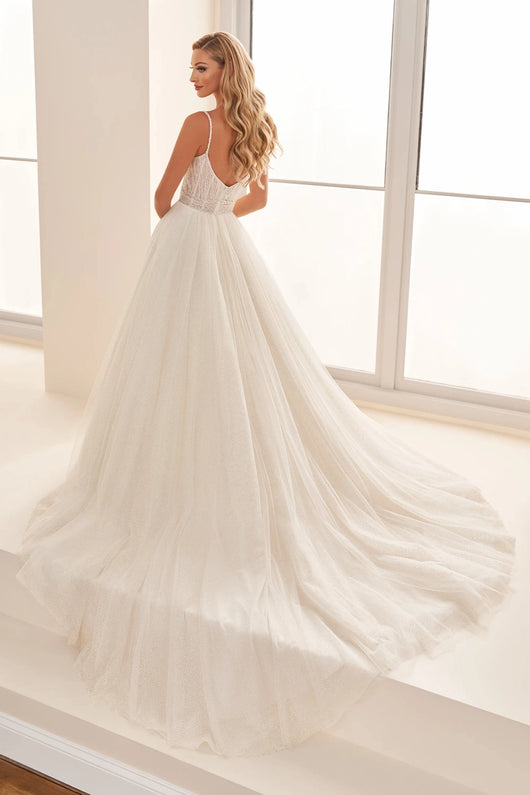 Make a statement in this dreamy A-line bridal gown. Crafted from delicate tulle and shimmering sparkle illusion, this ultra-romantic bridal style is simply breathtaking. A softly structured, semi-sheer bodice highlights the waist, while the stunning cathedral train ensures every step is a showstopper.