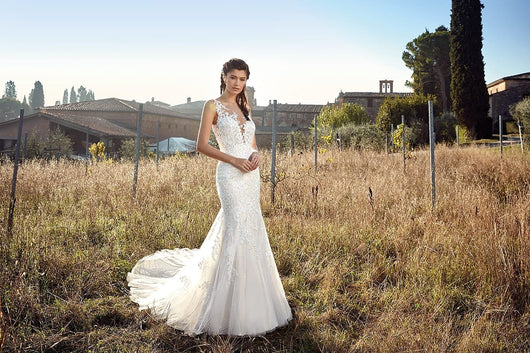 Impeccable lace starts from the bodice blending into floral appliques that embellish the train. Its fit-n-flare silhouette paired with the ravishing back detail makes this dress an exemplary gown for your special day.