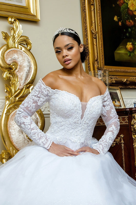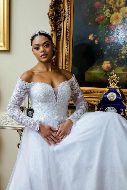 This glitter tulle A-line wedding dress features an off-the-shoulder neckline with sheer long sleeves and an illusion back.