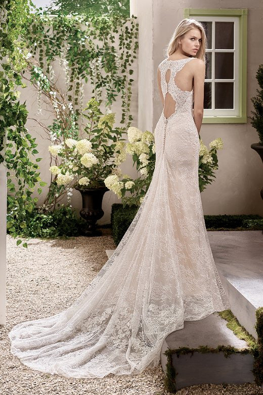 Chantilly Lace, Embroidered Lace fit and flare gown with a beautifully constructed back style. A simple, lace gown with lovely straps and a soft train that extends out.
