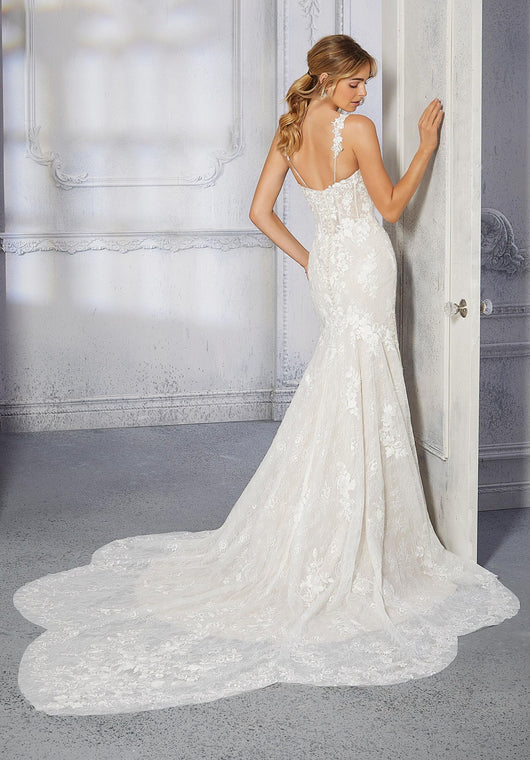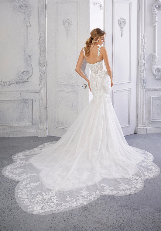Romantic sweetheart bodice features, sheer plunging detail adorned in sparkling crystal beaded, embroidered lace appliqués. The sultry fit and flare silhouette stuns in delicate frosted Chantilly lace and features a sheer, petal train. Get more options to customize your look with detachable crystal beaded, appliquéd straps, and a detachable tulle train overlay with lovely lace edging.