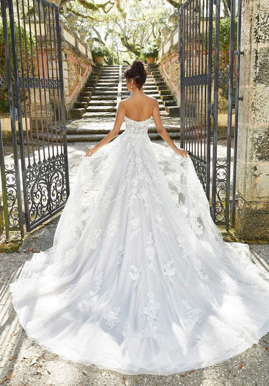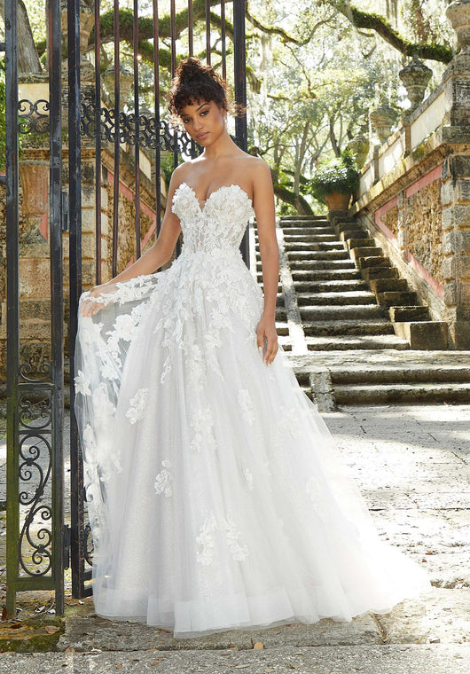 boned sweetheart bodice blooms with decadent three-dimensional floral embroidered appliqués with brilliant crystal beading. The sparkle tulle ball gown skirt delicately floats off the body and has a regal effect with its chapel length train, lined with horsehair edging