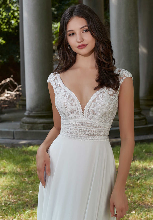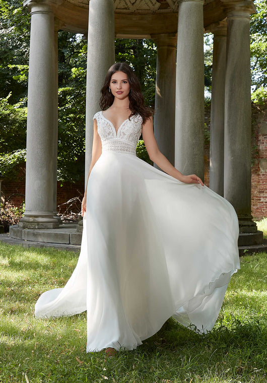 This wedding dress has a rustic charm with a delicately beaded embroidered bodice, over romantic Chantilly lace. The sculptured neckline has a lovely scalloped edge while the lace-up corset back will keep you looking cinched. The chiffon skirt beautifully billows off the body with a relaxed A-line silhouette that will have you floating down the aisle