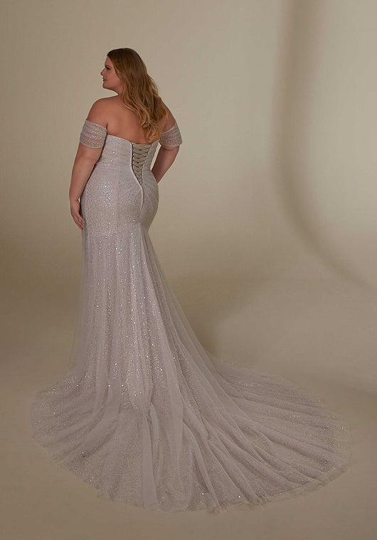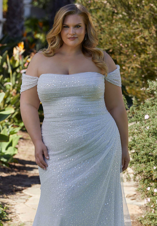 Glamorous fit and flare sparkles in allover beaded net with a draped tulle overlay and dreamy draped sleeves. Lace-up corset back keeps you cinched.