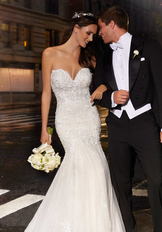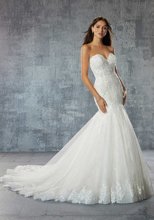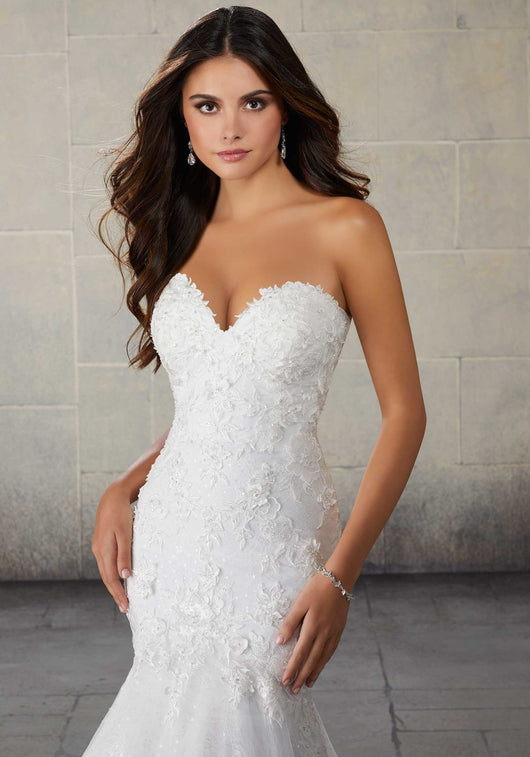 Crystals and pearl beading accent the mermaid silhouette. Three-dimensional floral embroidery adds dimension to the soft net over sequined chantilly lace. A lace trimmed hemline and sheer, pointed train complete the sophisticated look.