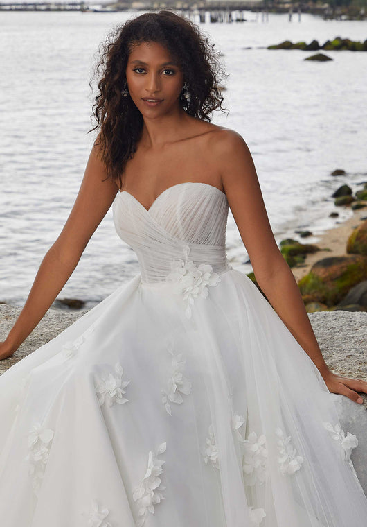 This wedding dress is a breathtaking ball gown full of whimsy. The boned sweetheart bodice features asymmetrical draping with three-dimensional floral accents that float down the dress. The airy tulle has an effortless look and we love the playful addition of the detachable floral off-the-shoulder sleeves.