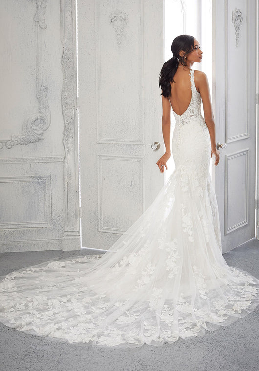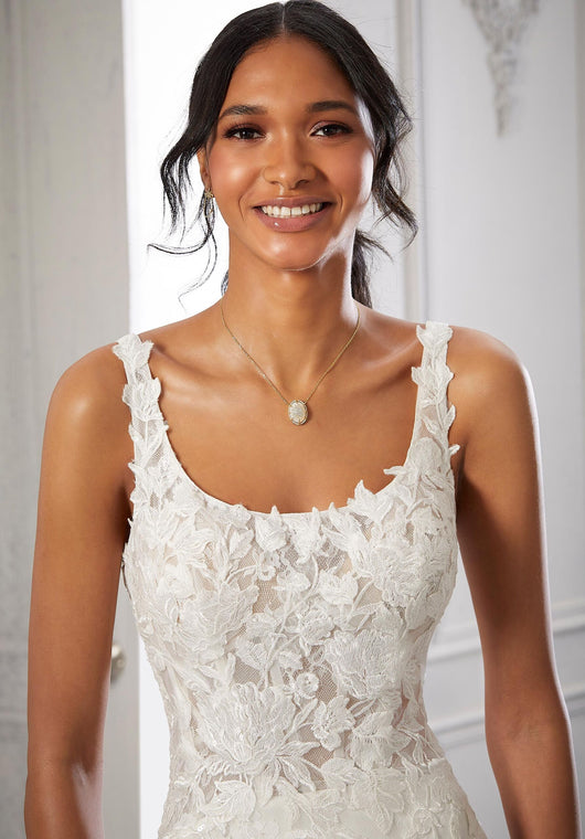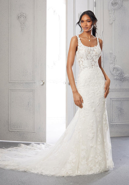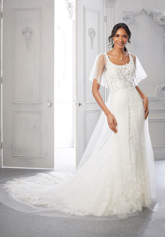 This dress is a stunning statement of polished perfection. Delicate frosted, embroidered appliqués line the sweet Chantilly lace fit and flare. We love the structured scoop neckline and matching scoop back, while the sheer train gives the dress an ethereal feel.