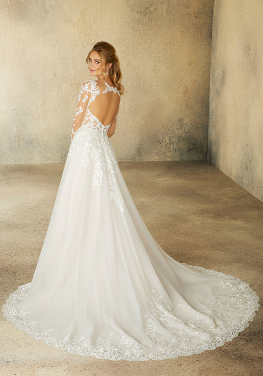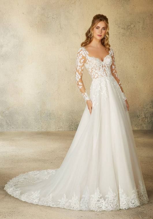 Pearl and Crystal Beaded, Embroidered Lace Appliqués on Net on an English Net, Soft Ball Gown with Scalloped Hemline.