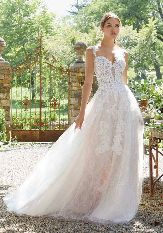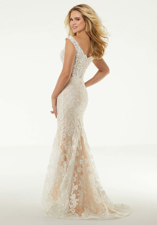 Classy off-the-shoulder prom gown with allover embroidery on sparkly net.
