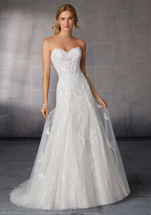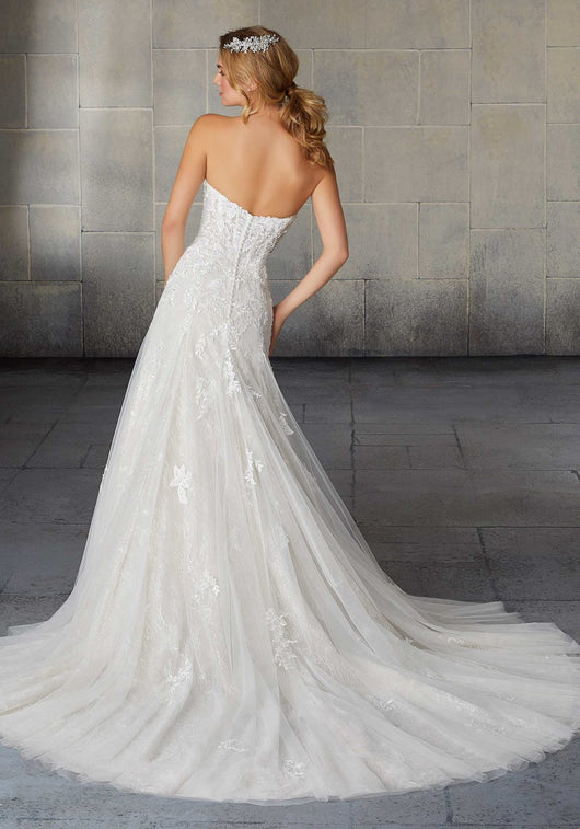 Soft and whimsical, our Shelly bridal gown features crystal beaded, embroidered appliqués on a soft net, godet A-line silhouette over frosted chantilly lace