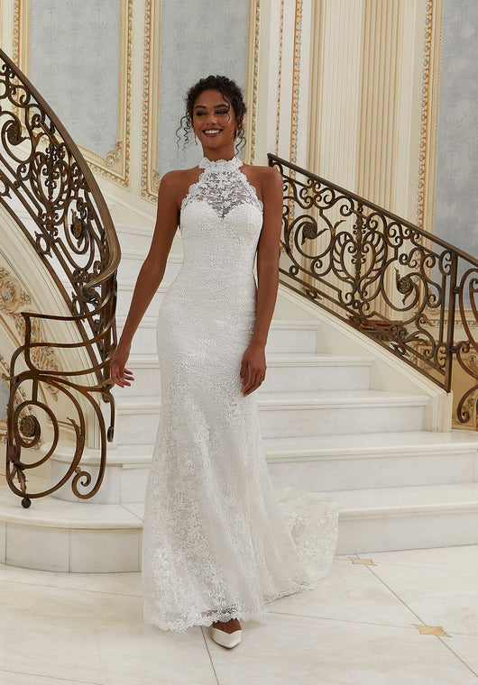 Sexy and sophisticated, our wedding dress is a new taking on a classic. The fit and flare silhouette looks luxe in allover frosted Chantilly lace. The collar-style halter neckline features an illusion panel to show off the sweetheart detail with scalloped edging for added texture. The delicate scalloped lace creates a beautiful frame for the star of the dress, the open keyhole back.