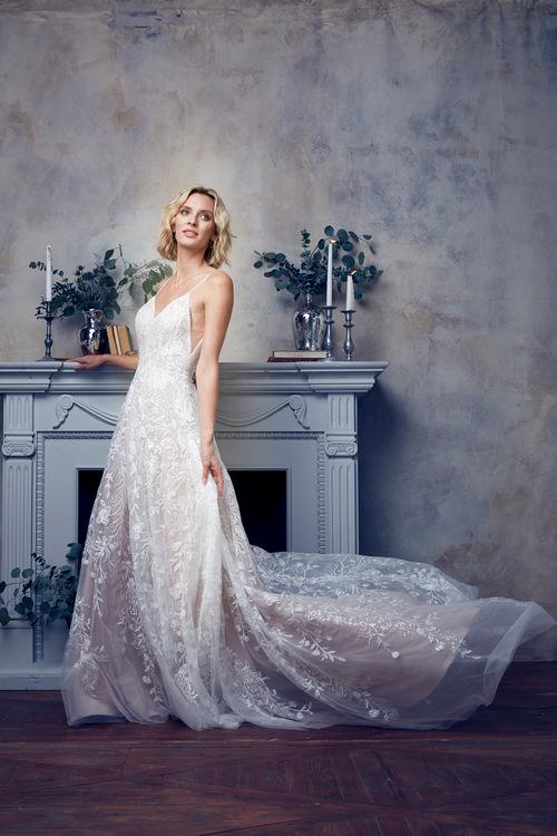 A-LINE GOWN WITH SEQUINED EMBROIDERED ALLOVER LACE ON TULLE & UNLINED BODICE