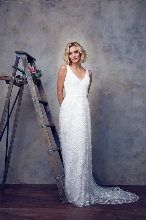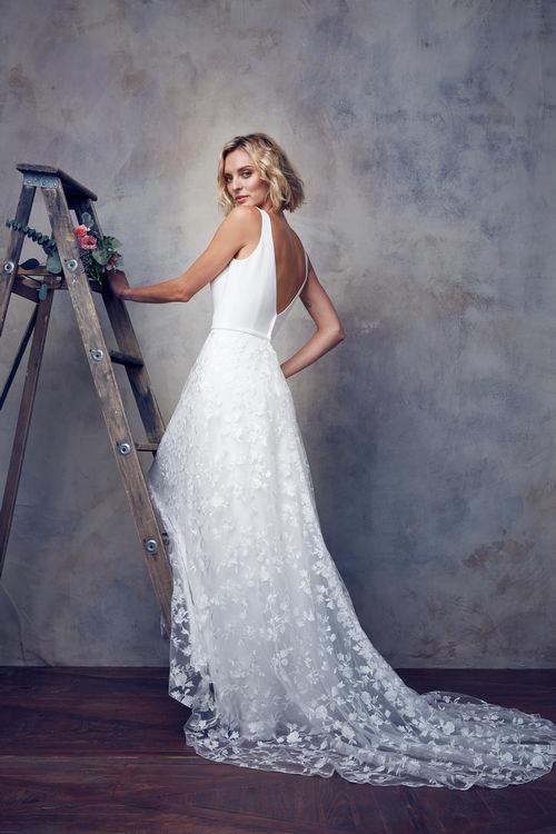 A-LINE GOWN WITH PLAIN CREPE BODICE AND ALLOVER LACE SKIRT