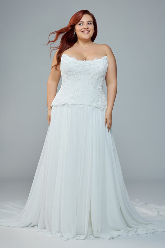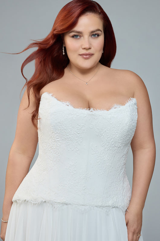 Designed for high-impact entrances, Sirena delivers grandeur with an editorial edge. With a sculpted satin bodice and a voluminous ballgown skirt that feels almost alive, this dress was made for brides who want to take up space in the most unforgettable way. The popular scoop neckline adds bold softness, while sheer side panels with illusion boning bring structure and edge. A lace-up back completes the look with classic corsetry detail and an ultra-flattering finish. Her skirt features carefully placed pickups throughout, creating movement, depth, and undeniable drama with every step. Part princess, part runway: Sirena is where high fashion meets modern fairytale.