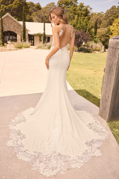 This dress is a true bohemian beauty with a touch of contemporary romance crafted from luxurious materials, including misty tulle, and it features a unique high-illusion lace neckline that is guaranteed to captivate your wedding guests. The semi-sheer bodice is adorned with intricate sequined lace detailing creating a subtle yet alluring play of textures. The daringly low illusion lace keyhole back is a unique feature, perfect for the bride-to-be wanting a bridal gown with modern trends. It gracefully transitions into a crepe fit and flare skirt with a slit, accentuating your silhouette with every step whilst ensuring ease of movement. Fabric-covered buttons draw your eye to the edge of the enchanting laser-cut floral train.