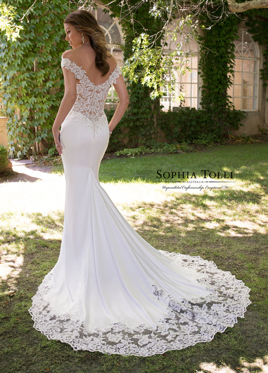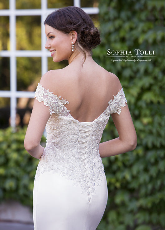 A classic style, crepe satin fit and flare gown with jersey lining for the ultimate in comfort and fit. It features a sweetheart neckline with detachable off-the shoulder lace straps to transform your look in an instant, an asymmetrically side draped midriff and skirt, an illusion low cut back richly adorned with beaded lace appliqués, a zipper trimmed with diamante buttons, and a modest chapel train with a cut out hem panel for a floating lace finish.