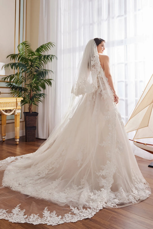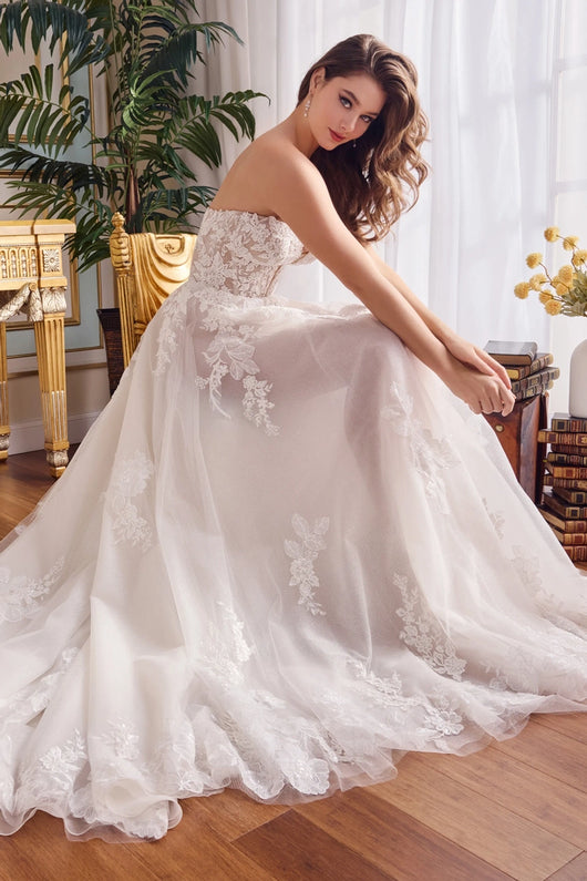 Embrace the whimsical romance of this breathtaking ball gown. Thoughtfully crafted from sparkling glitter tulle and dreamy organza, this stunning style features a flattering deep-plunge sweetheart neckline and separate semi-sheer illusion bishop sleeves. A spectacular cathedral train  trimmed in delicate floral lace applique completes this fairy tale style.