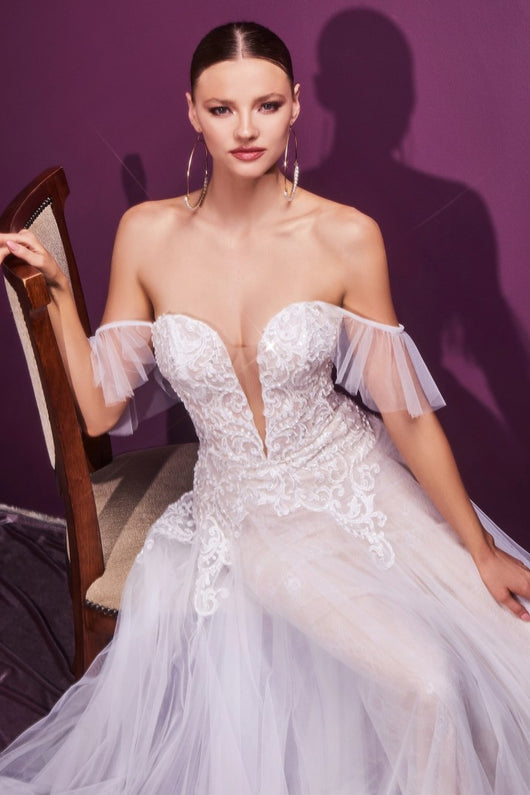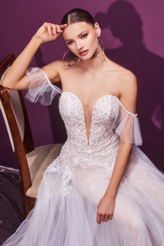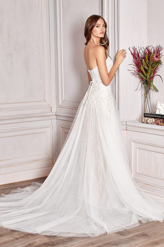 This diaphanous gown features a strapless sweetheart bodice embellished with delicate lace appliqué and beaded accents. It has supportive internal boning and a plunging illusion v-neckline. The back is designed with corset-style lacing for a customized fit while the skirt flows to a gentle A-line silhouette cut from layers of frothy sheer tulle and chantilly lace.