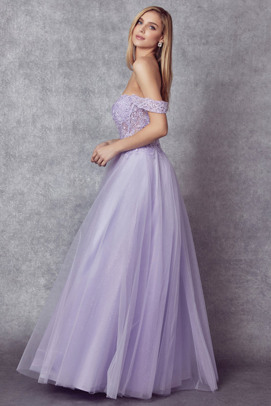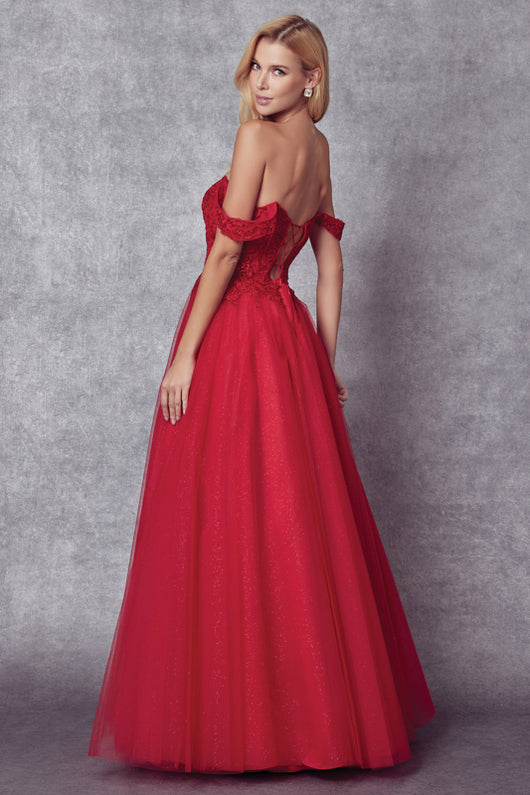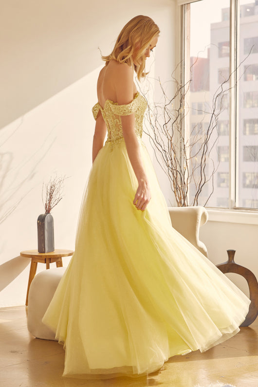 Elegant tulle prom gown features embroidered bodice ,off the shoulder sleeves and straps open back