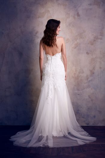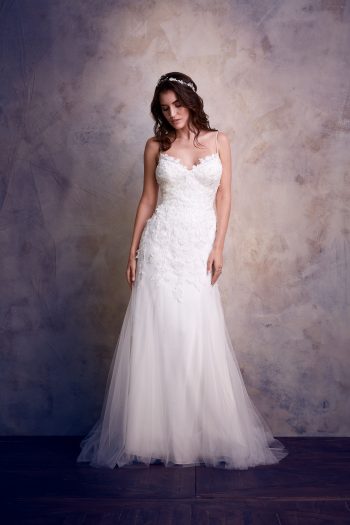 Floral Lace wedding dress with flowy skirt and and thin straps